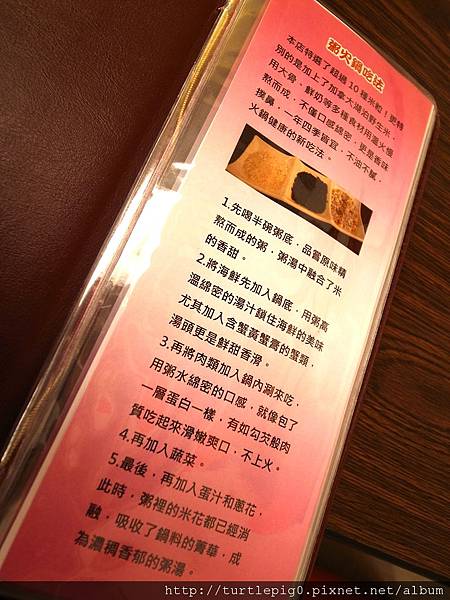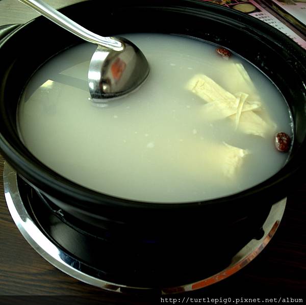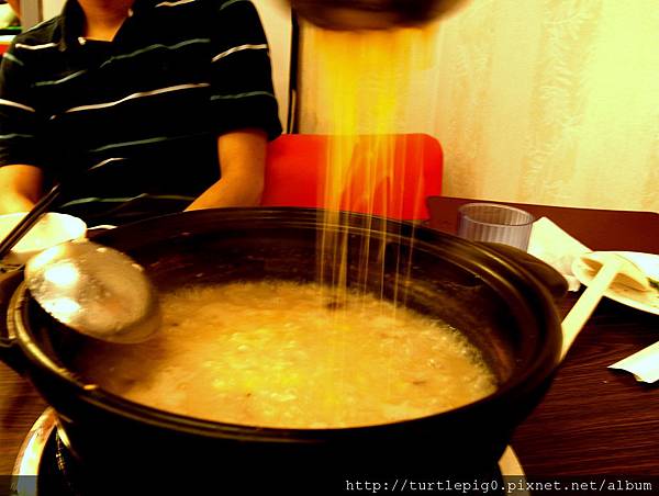 這二家店的粥火鍋其實是先用煮粥的湯作為湯底,配上以海鮮為主、肉片及菜盤為輔的火鍋料,店家教吃的順序: 1、沒有下任何料前,喝點火鍋清湯。-->先煮海鮮-->再來肉片-->然後其他,清湯淡淡的,但帶有粥香,算是特別。