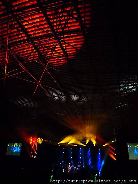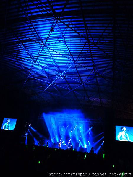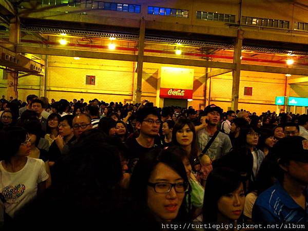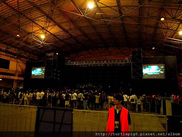 一把老骨頭,才第一次去聽全場無座的演唱會, 場地在世貿二館,場內很陽春,因為老爺的關係,只買了最便宜的票區1300元(另二區為3800元、2500元),八點開場,我們七點半到,勉強可以擠到這區第三層,我旁邊是二個小毛孩,身上全是汗水臭味,大家貼身站在一起,我的袖子都是小毛孩的汗水…未開場前痛苦萬分。