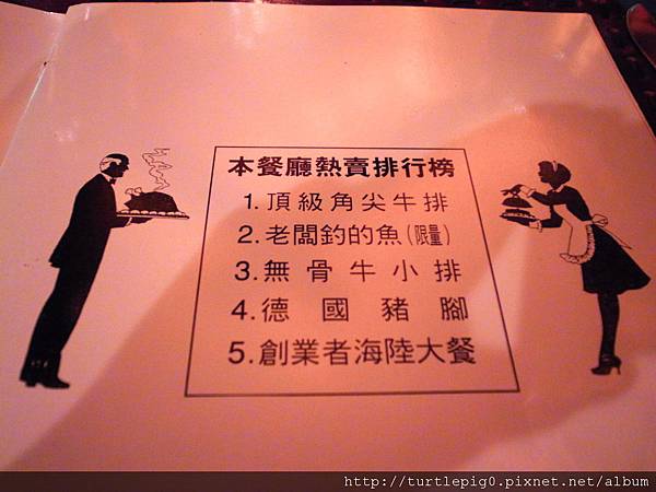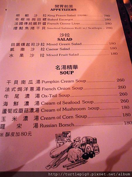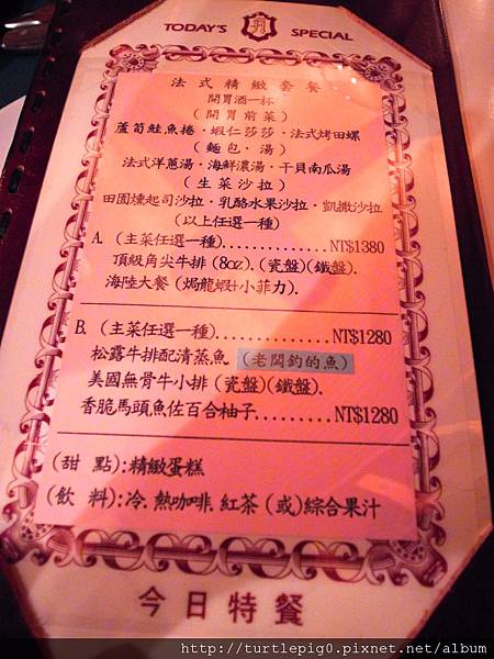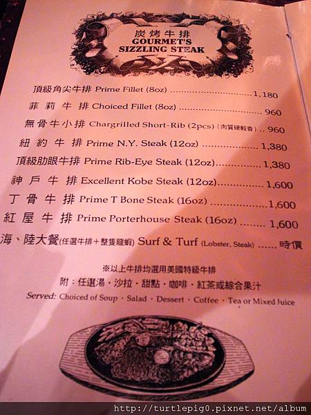 結果我們都沒點上面的推薦,因為通常非點肋眼牛排不可。另一道,老爺說網路推薦焗龍蝦,所以就點了焗龍蝦+小菲力的套餐。